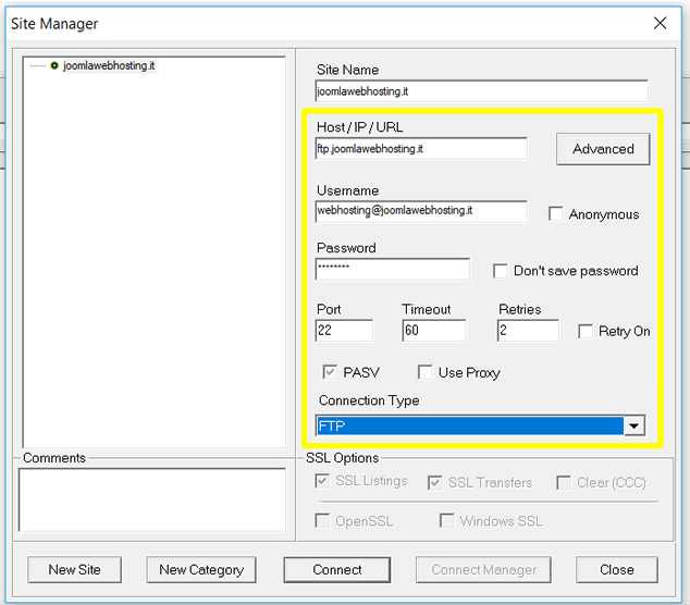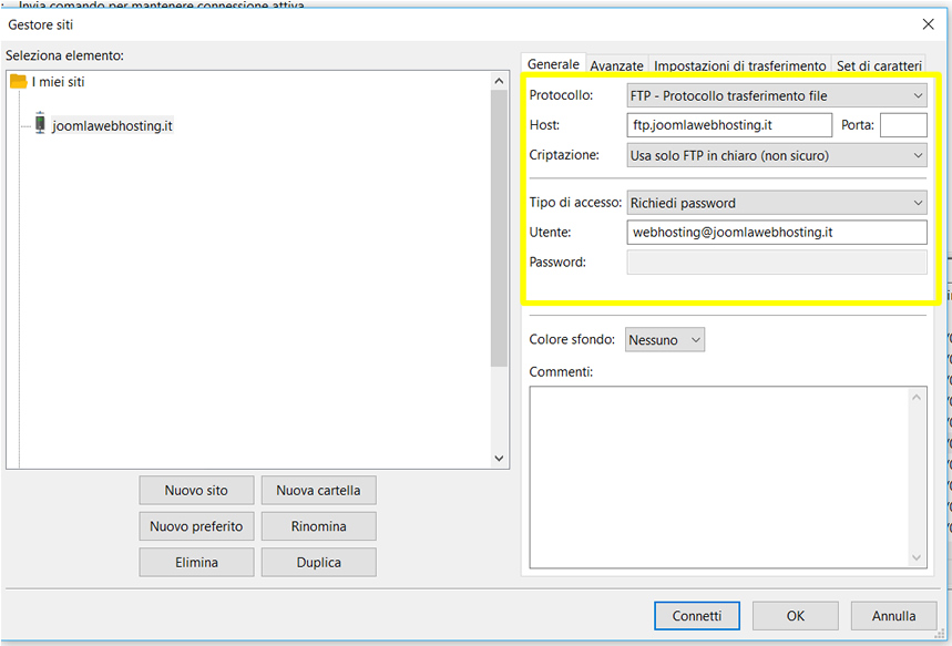 HOST/URL: ftp.nomedominio oppure IP del server indicato nell'email di attivazione